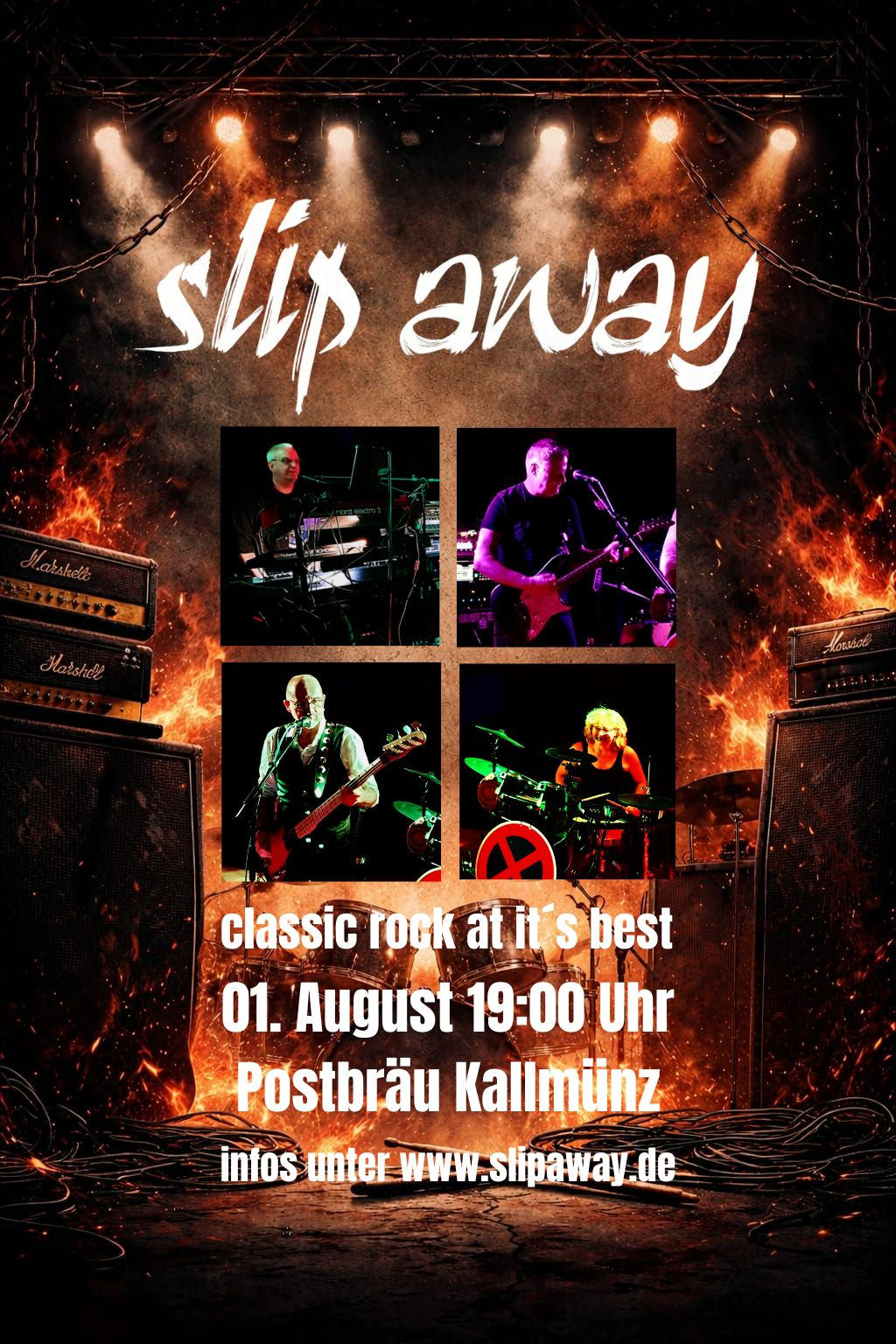 slip away das sind vier Freunde, die für Musik brennen und seit Ihrer Jugend in verschiedensten Regensburger Bands wie Dr. Pepper, Roadie Nice, Warp Seven, Maja and the Chilly Willies, Pete and the Nasty Dogs, gamsig, daeftig, Jeffry Hudson Bitters oder Doc Her bRain unterwegs waren oder sind und deren Wege sich dabei immer wieder gekreuzt haben. Das zunächst nur als Spaßprojekt für private Feiern und selbst organisierte Auftritte im erweiterten Freundeskreis ins Leben gerufene Projekt hat sich dabei nach einigen Besetzungswechseln zu einer ernstzunehmenden Konkurrenz für die etablierten Mitbewerber im Raum Regensburg entwickelt.